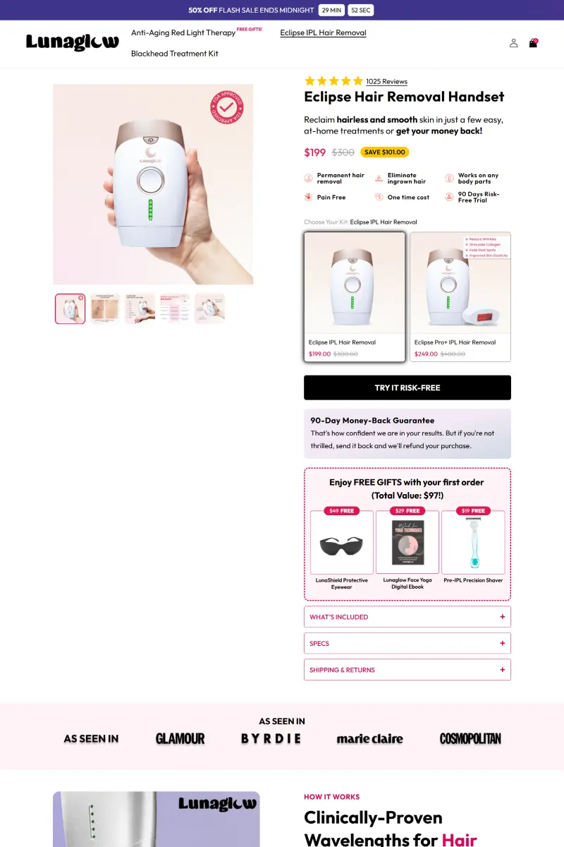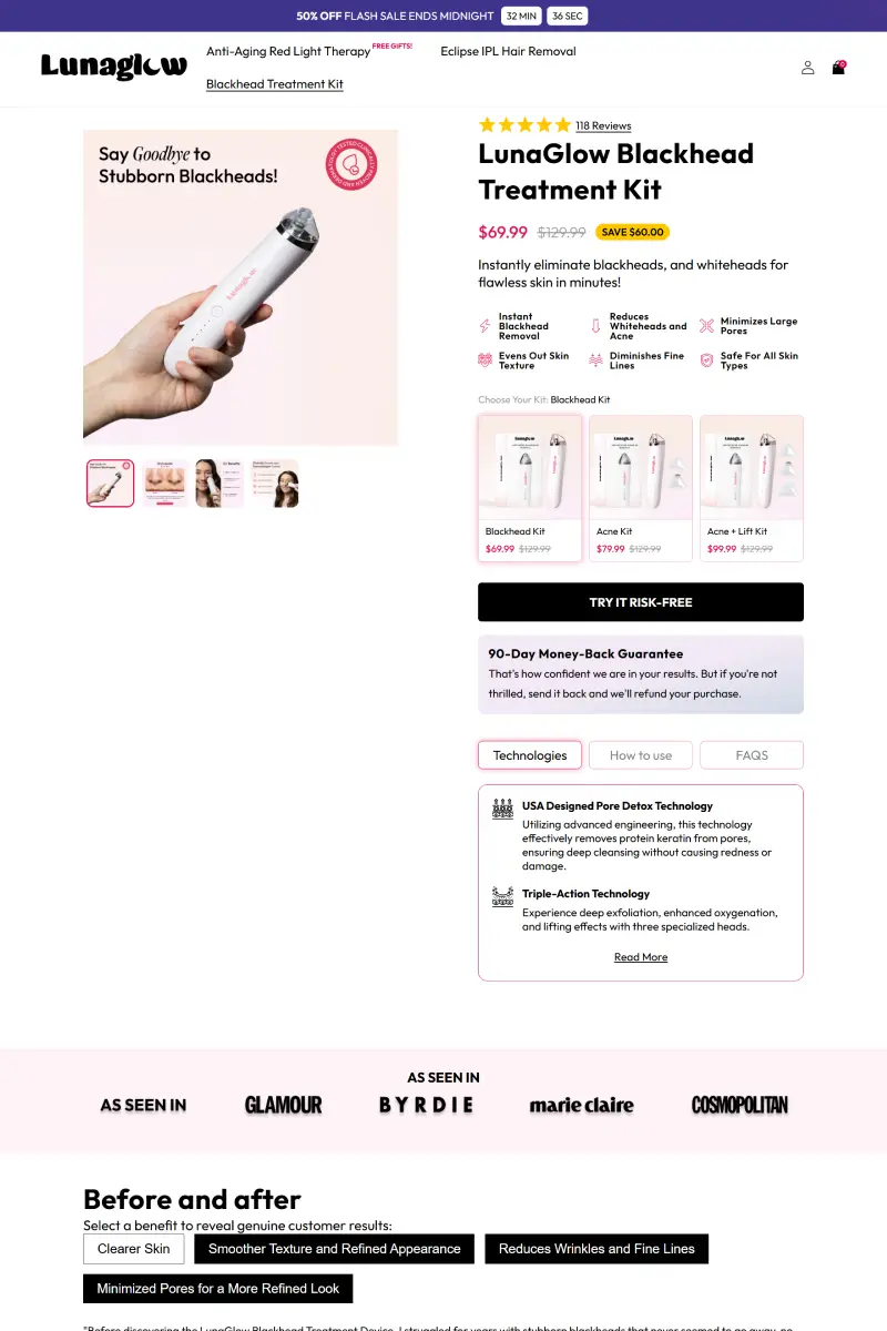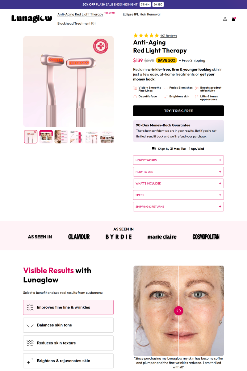 This project focused on a beauty tech eCommerce website that offers at-home skincare solutions using advanced technologies like red light therapy and IPL. The platform highlights convenience, effectiveness, and self-care, positioning professional-level treatments as accessible for everyday users.