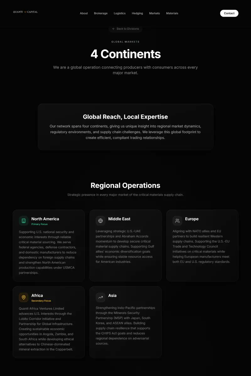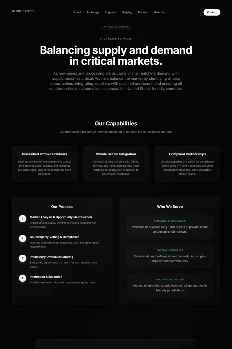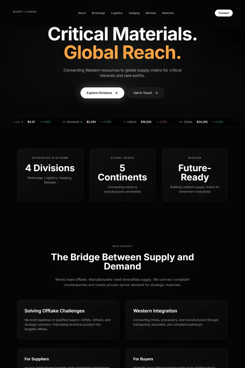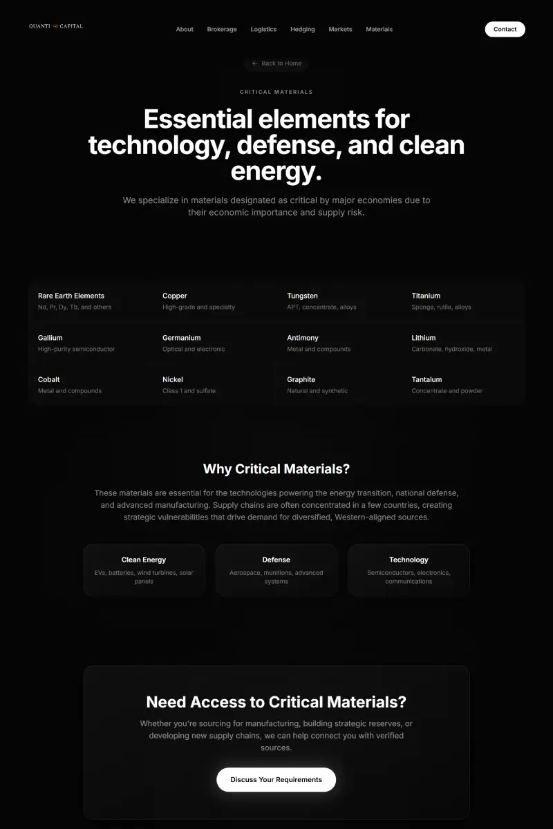 This project focused on a strategic trade and investment website that connects global suppliers and buyers of critical minerals and rare earth materials. The platform emphasizes building resilient supply chains, using data-driven insights and strategic partnerships to support industries like aerospace, defense, and technology.