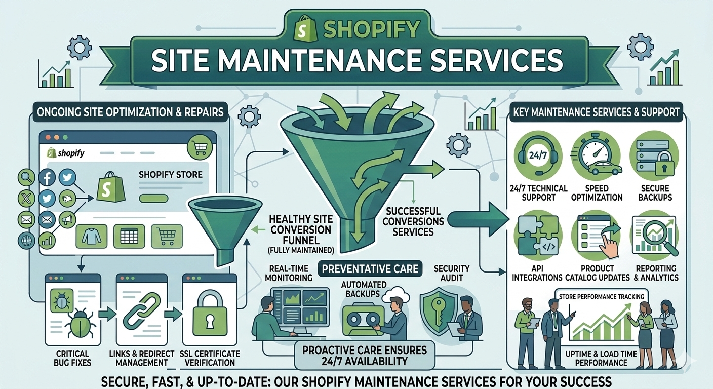 Running a successful Shopify store requires more than just launching a website. Continuous monitoring, updates, and technical maintenance are essential to ensure your store runs smoothly and securely. Our Shopify Site Maintenance Services are designed for eCommerce brands, Shopify store owners, and growing online businesses that want to keep their stores stable, fast, and fully functional.